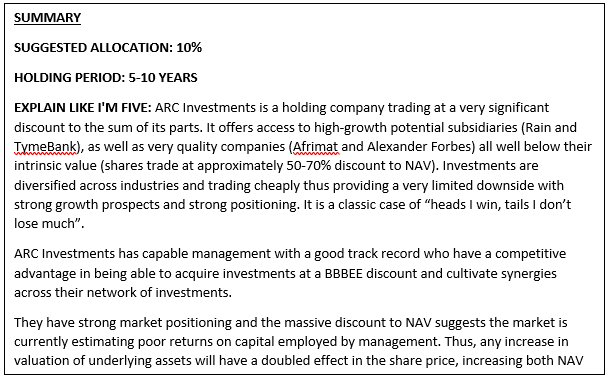 Prominent South African economists, Viljoen and Thokan have both suggested the discounts holding companies are receiving is primarily due to market irrationality. Many of them own high quality underlying stock and, per Thokan, “And irrespective of the economic environment, we are seeing high quality companies still compounding their earnings growth above 10% and generating good free cash flow”. Note however, this is not an ARC specific comment. It is merely of interest that many SA companies are currently undervalued relative to their quality.