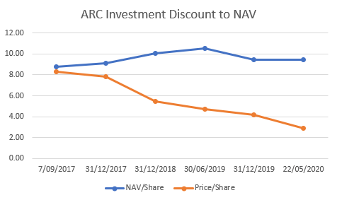 The figures below suggest that ARC is currently trading at a discount even to its average discount – which has admittedly been widening over the period since listing.