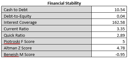 The company has grown at respectable rates over the last 10 years (Figure 5), and is sitting in a comfortable financial position (Figure 6) with minimal debt, a strong cash balance, healthy financial stability (a Piotroski F-Score of greater than 4) and is nowhere near bankruptcy (an Altman-Z Score of greater than 2.99).