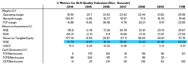 In Figure 7 although erratic, the metrics for ALH suggest it is a high-quality company as defined above. The ROIC (highlighted in blue) has in recent years improved significantly because of the company’s expansion overseas (along with most other metrics) to the point that it now far outsizes the company’s WACC. This is indicative of a company generating more value than it absorbs.