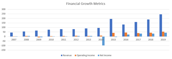 The company has also been growing revenue steadily over the past decade. The large difference between revenue and operating or net income, as well as the large loss in 2014 distorts the image on the graph, but net income and operating income have been similarly growing since 2007.