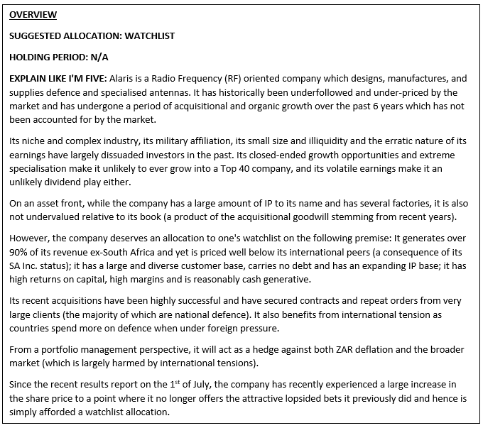Should the share price fall to around R2/share, the company will become far more appealing from an investment perspective. Although there is likely still significant upside in the long-run, the risk-to-reward odds are no longer stacked in our favour. Hence, it is a temporary watchlist-only allocation for ALH.