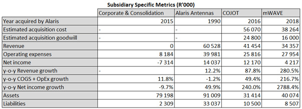 Alaris Holdings was founded in 1990 as the defence division of Poynting Holdings, a general antenna manufacturer. They listed on the JSE in 2008 and struggled through several years until PSG stepped in as an anchor shareholder and helped repair their balance sheet. In 2015, Alaris (the profitable defence division) split from the struggling Poynting which went on to be delisted as a private entity run by the co-founder Andre Fourie.