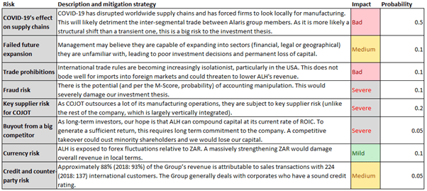 The biggest risk by far to the investment is the potential disruption of COVID-19 on supply chains (Figure 15). As nations consolidate their supply chains and localise their suppliers, isolationism and protectionist policies are likely to flourish. Regarding the short term effects of the virus, CEO Dresel said that the company has a diversified supply chain and sufficient working capital for the short to medium run. However, per analyst Irnest Kaplan‘s comments to the Business Day newspaper, the virus is likely to result in a slowdown in the firms immediate business.