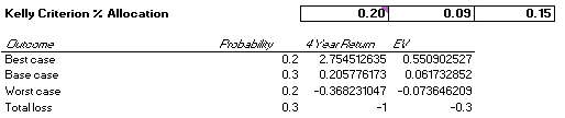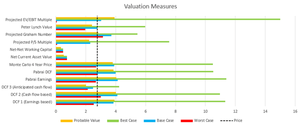 Figure 4 has used various valuation methods to arrive at a spread of valuations. All have been very conservative. The probabilities for the best-, base-, and worst-cases are 20%, 30% and 20% respectively with a 30% probability of total loss occurring. As such, the probable value is the sum of the valuation of those cases weighted with their probability. It is likely that these estimates are too conservative and underemphasize the difference between the intrinsic value and the market price.
