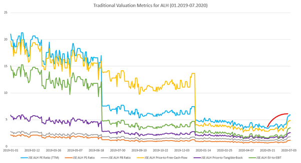 Barring the recent jump in share price (approximately 60%) during the time of writing this article, Alaris has been perpetually undervalued by the market. Figure 1 shows the current traditional valuation multiples over the course of 2020. The red line shows the time of writing.