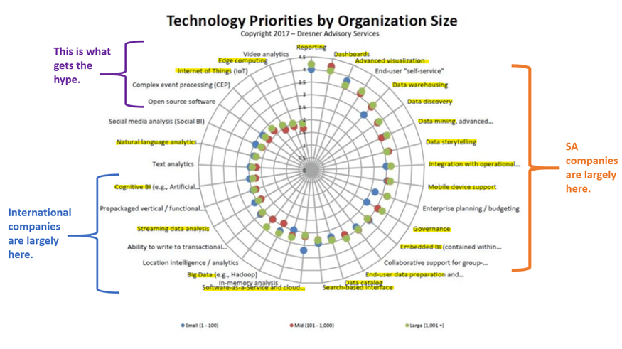 Cloud use (a massive data generator) is already entrenched in many businesses. With more people working remotely, productivity data is increasingly important to track. As far as BI adoption goes, Africa has a way to go before it competes with the global players. Fortunately, PBG’s offerings are largely aligned with the needs of SA’s lagging adopters. Figure 8 below outlines rough tech priorities for companies on a scale from 0-5, with 5 being the most important to adopt. The skills highlighted in yellow are those PBT has exemplar cases on.