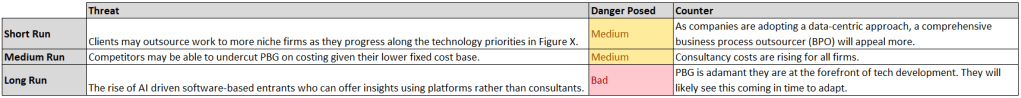 The financial services industry is prone to disruption. Not only is PBG subject to innovative competitors, but most of its clients are under similar threat. As long as PBG continues to innovate and adopt best practice tech, they buy themselves time against disruption. The downside of this is that it mandates continual investment into upskilling the employee base and does not constitute an orthodox “moat”.