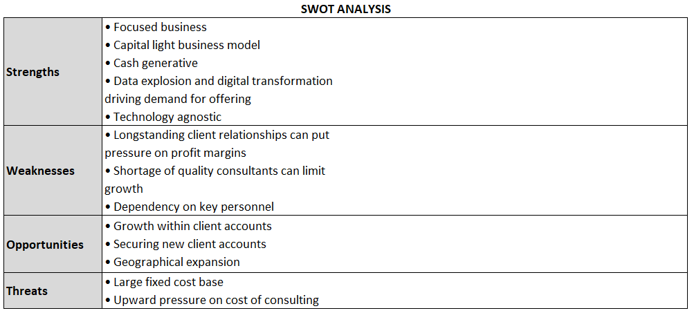 Externally, their exposure to South Africa and the discretionary spending of her financial companies means they will struggle as the country and sector do. Further, as a tech-centric company, they are subject to disruptive innovation from competitors and will need to compete to stay abreast.