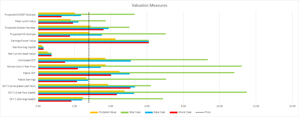 The final element of a contextual analysis is valuation. The below Figure 12 shows roughly how the market is pricing PBG relative to its potential futures. The worst-, base-, and best-case scenarios are shown below, each with a 20%, 30%, and 20% chance of occurrence, respectively. There is also a 30% chance of total loss.