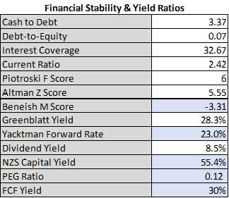 Currently, Figure 15 below outlines a very resilient financing structure for PBG. They have low debt and plenty of buffer in their balance sheet. The various scores (explained here) suggest a very stable position, while the yields and forward rates (heuristics designed to approximate future returns without predictions) all indicate a very positive outlook. Finally, their (altered) PEG ratio suggests substantial underpricing relative to growth shown – in this case, operating income rather than earnings was used for the PEG calculation as it more accurately reflects the growth of the business.