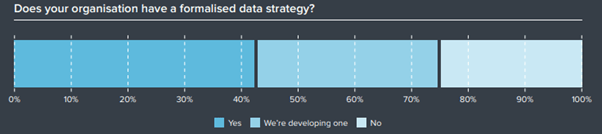 The drivers for BI adoption are primarily competitiveness and the operational efficiencies it can bring; however, governance is also playing an increasing role.2 Companies are increasingly aware of the need for BI and data engineering: per Figure 18 below, 30% of local companies are in the process of adopting a formalized data strategy.