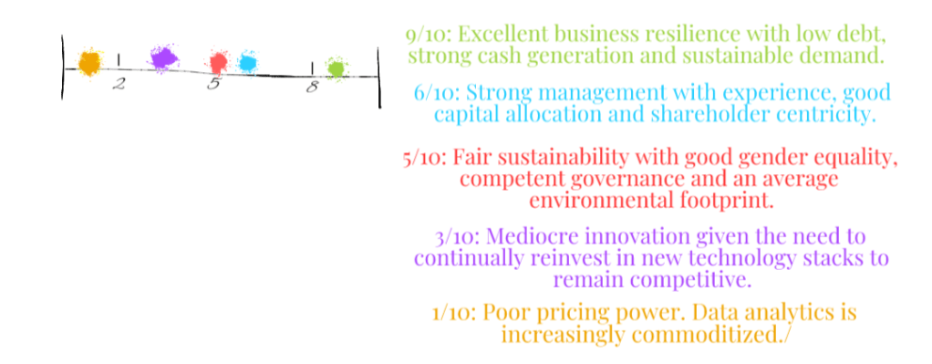 Unfortunately, the company has little-to-no competitive advantage or “moat” barring some relational capital. Their service is not too differentiated from other data-based consultancies. The balance sheet is very conservative, they are very cash generative, and their services are likely to be in strong demand over the coming years. They are a reliably resilient business.