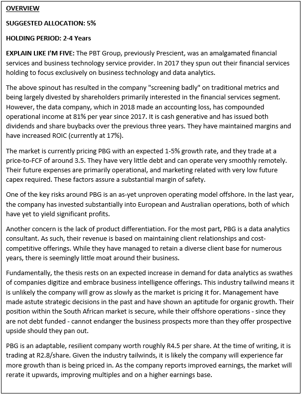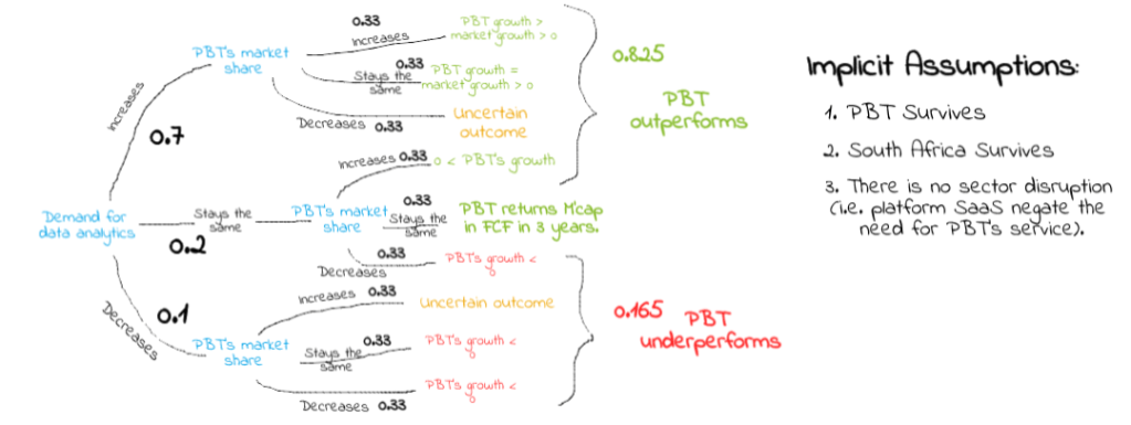 It is easy to broadly predict that South African companies will need to spend more on AI-implementation and data analytics in years to come. It is much harder to predict narrowly that such spending will fund our thesis for PBG specifically. Further, immediate investments are likely to be curtailed and placed on hold because demand for primary services is in a COVID-19 catalysed decline.