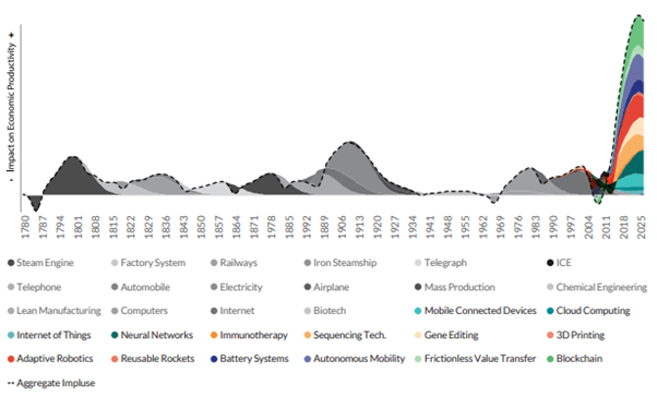 Figure 4 outlines the theoretical compounding of many different innovative technologies being developed. The grey elements are the estimated impact previous technologies have had globally. Note how the period 1889-1920 is characterized by the inventions “stacking” in their impact. The estimated “stacking” in today’s time is unprecedented.